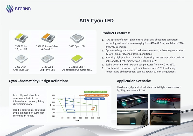聚焦车辆环境感知增强与道路环境协同通信,本次研讨会凯发k8国际展出的ADS Cyan 蓝绿光LED,采用直发光芯片/荧光粉双技术路线,打造高辨识度与可见度智驾标识,色区涵盖主波长490-497.5NM,在雨雾/夜间穿透力提升30%,可适用前照灯、传感器辅助光源及V2V信号标识场景,且符合欧盟ROHS认证。